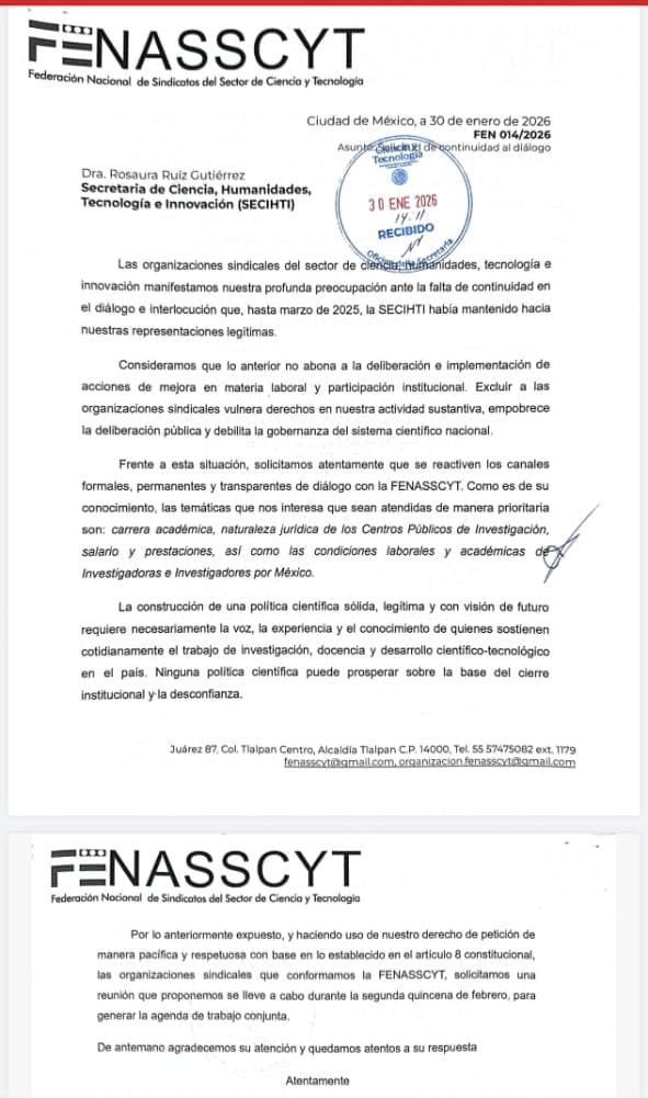 La FENASSCYT es una Organización Sindical con carácter Nacional, convencidos de la necesidad de sumar fuerzas para el impulso de las Ciencias, Humanidades y Desarrollos Tecnológicos en bien de la sociedad Mexicana y del País, por lo que demandamos la reapertura del dialogo con la SECIHTI.