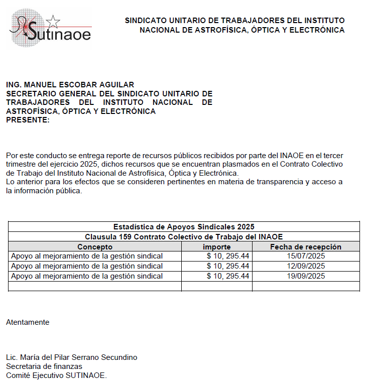 EL SINDICATO UNITARIO DE TRABAJADORES DEL INSTITUTO NACIONAL DE ASTROFÍSICA, ÓPTICA Y ELECTRÓNICA con siglas SUTINAOE, que se encuentra en el domicilio calle Luis Enrique Erro No. 1 sin colonia, Santa María Tonantzintla, San Andrés Cholula Puebla C.P. 72840, teléfono 222 2663100 ext. 5262, sitio de internet http://www.sutinaoe.org.mx, es el responsable del uso y del tratamiento de sus datos personales que nos proporcione, los cuales serán protegidos conforme a lo dispuesto en los artículos 8, 15, 16 y 17 de la Ley Federal de Protección de Datos Personales en Posesión de los Particulares.